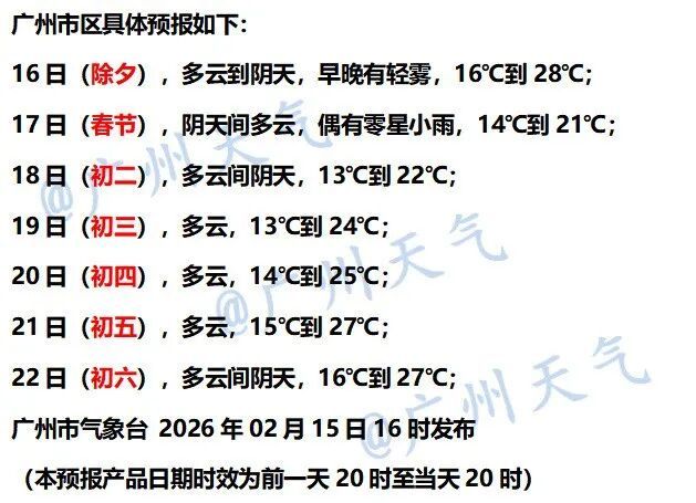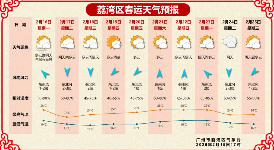 2月16日,多云到阴天,早晨有轻雾,19~28℃,相对湿度60%~90%;17日阴天间多云,16~22℃;18日多云间阴天,15~24℃。(荔湾区气象台2月15日17时发布)